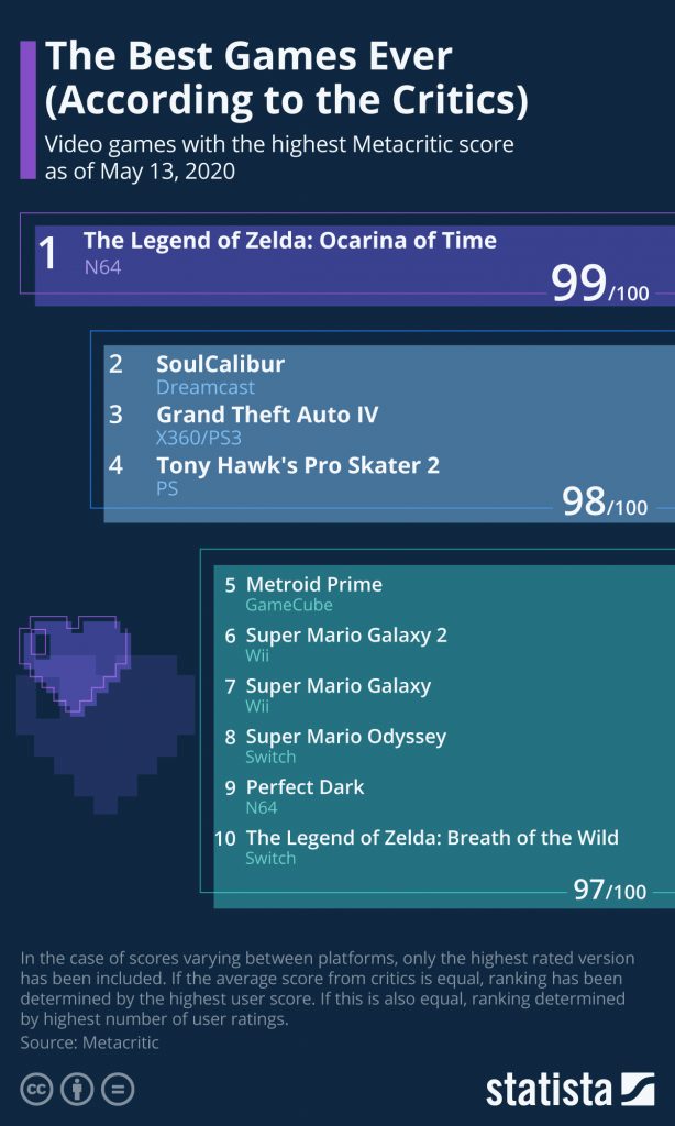 Kriitikoiden mukaan paras koskaan tehty peli on The Legend of Zelda: Ocarina of Time. N64-peli julkaistiin vuonna 1998 ja se sai lyömättömän keskimääräisen pistemäärän 99/100. Sen kaatamiseen tarvitaan jotain todella ainutkertaista. Tietenkin internetin aikakaudella arvosteluja on kirjoitettu paljon enemmän, mikä lisää todennäköisyyttä huonoille arvosteluille ja matalammalle pistekeskiarvolle. Lähes kaikki on kumminkin sitä mieltä miten täydellinen Ocarina of Time on. Itse asiassa, vaikka pistemäärä 99 perustuu vain 22 kriitikon arvosteluun (verrattuna The Legend of Zelda: Breath of the Wild’s 109: een), 5087 pelaajaarvostelua antoi 9,1/10 keskiarvon.